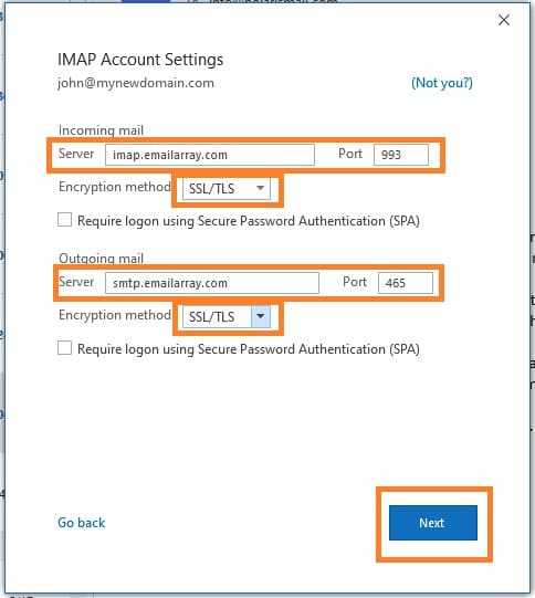 Server details: Server address Recommended Port (SSL) Optional Port (no Encryption and TLS)