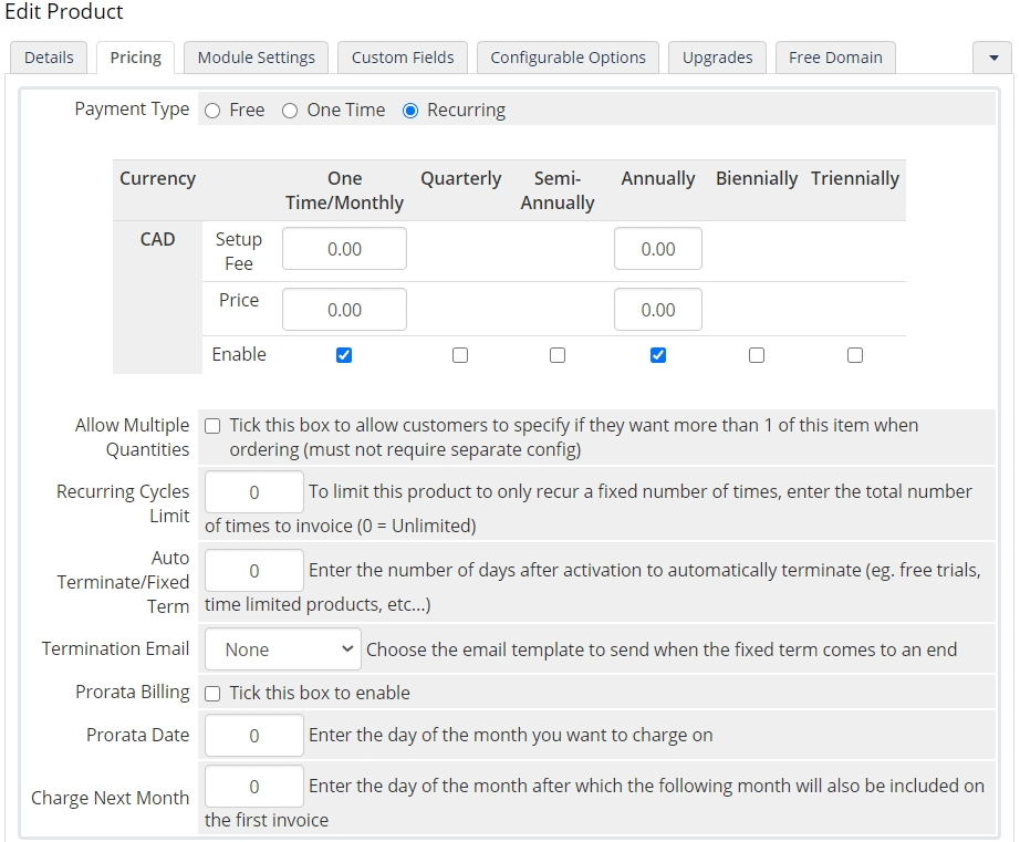 Pricing tab: set your product to “Recurring” and leave the price set to 0. The price will be calculated using the Configurable Options. Enable payment for the prepayment options you want to offer: monthly, yearly, etc.