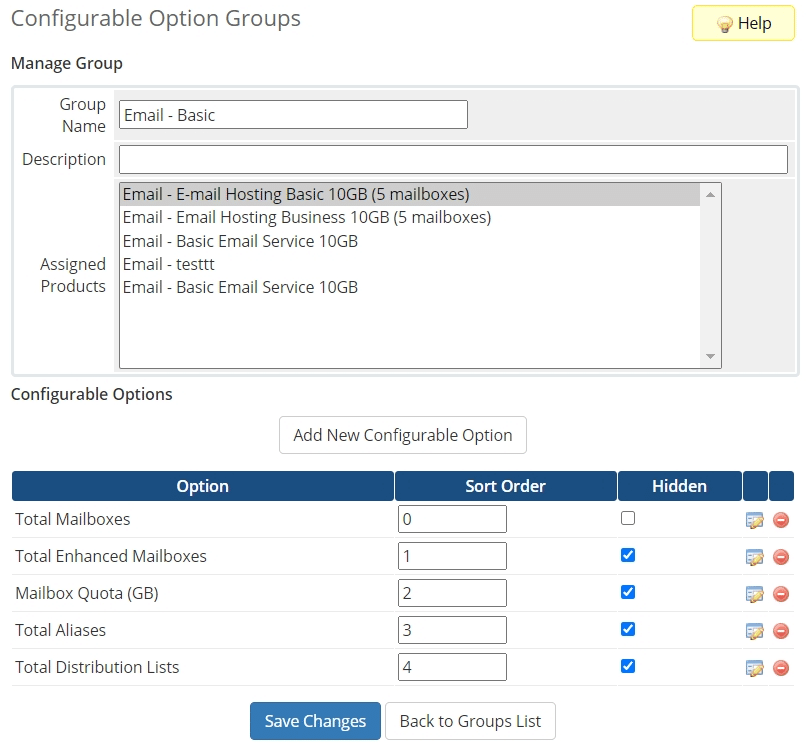 - The Configurable Option Group doesn’t have all these Configurable Options: Total Mailboxes, Total Enhanced Mailboxes, Mailbox Quota (GB), Total Aliases, Total Distribution Lists; they have a misspelling, or they don’t have a value assigned, even if it’s zero