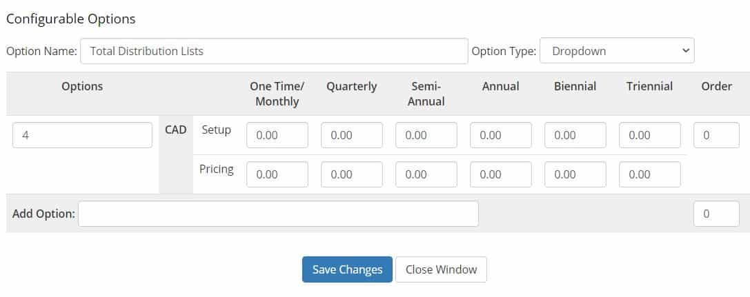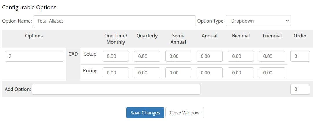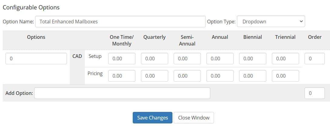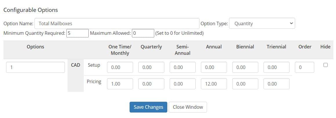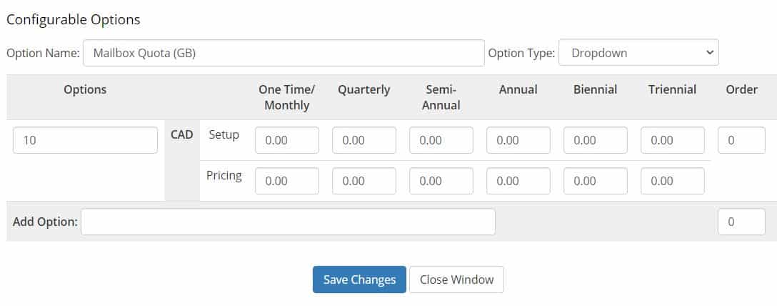 Tip: you cannot have multiple options with different pricing for “Mailbox Quota (GB)” if your “Total Mailboxes” or “Total Enhanced Mailboxes” are variable (it will work but it will break the pricing).